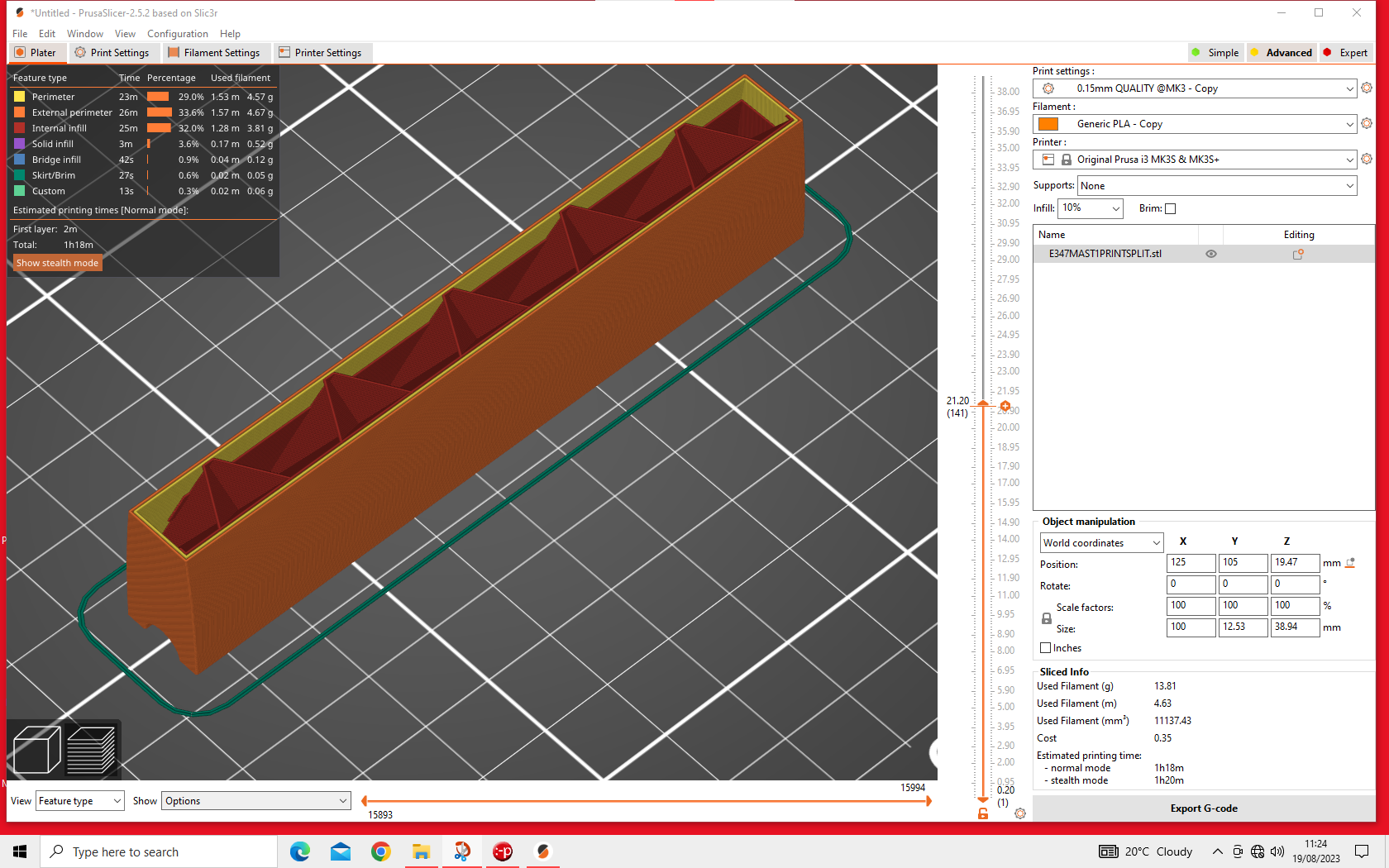 This is a screenshot of the slicing programme output of a vertically extruded printed core with internal bracing. Presently there are machines that can print to 2.1 metres high, although I have encountered vibration problems with smaller scale objects.
