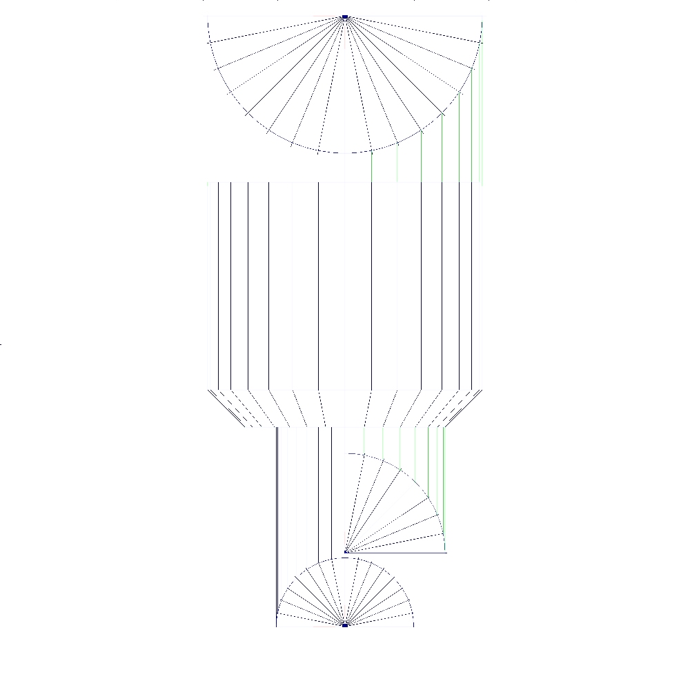 So…..using my trusty 2D drawing package I started to try and generate a fish shape. I took a NACA 63 profile and at each station I drew an ellipse at 0.75, that is the radius is three quarters the radius of the circle at 90 degrees. (Stations are at right angles to length ways axis of a boat or a plane and become the cross section). I then added radii to mark out where the length-way pieces would go, they are know as longerons. In exactly the same way I did with the tool drawings I projected the intersections back to the vertical and horizontal.