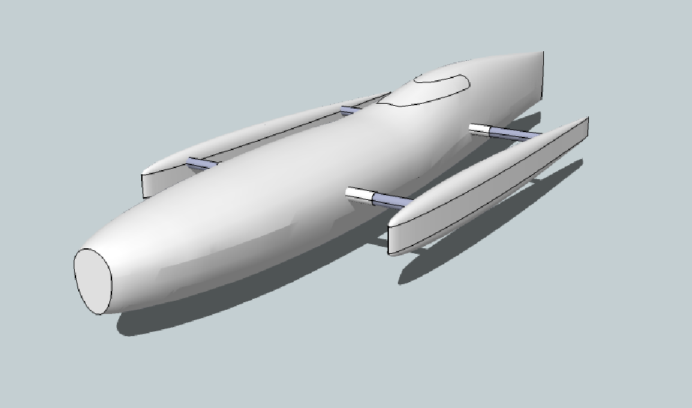 I chose an Eppler aero profile #347 for it’s low drag characteristics while also retaining enough ‘’body’’ to make a viable hull. This was rotated 360 degrees and left complete. There is no rudder system shown, possibly the keel foil can be used to steer.