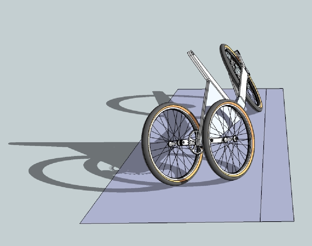 I repeated the process with the rendered body and the 26 inch wheels and straight axle to check for clearance, and this is what you get. I still have to carry on with the development of the one piece axle/nose and body bending design, but this is a good indication the geometry might work.